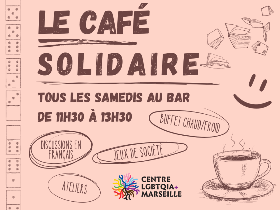 Venez partager un café, un jus, des gâteaux et des petits sandwichs lors de notre café solidaire chaque semaine. Ce sera l’occasion de se retrouver pour un temps de rencontre, de partage et de convivialité, ouvert à toutes les personnes LGBTQIA+ et allié·e·s.