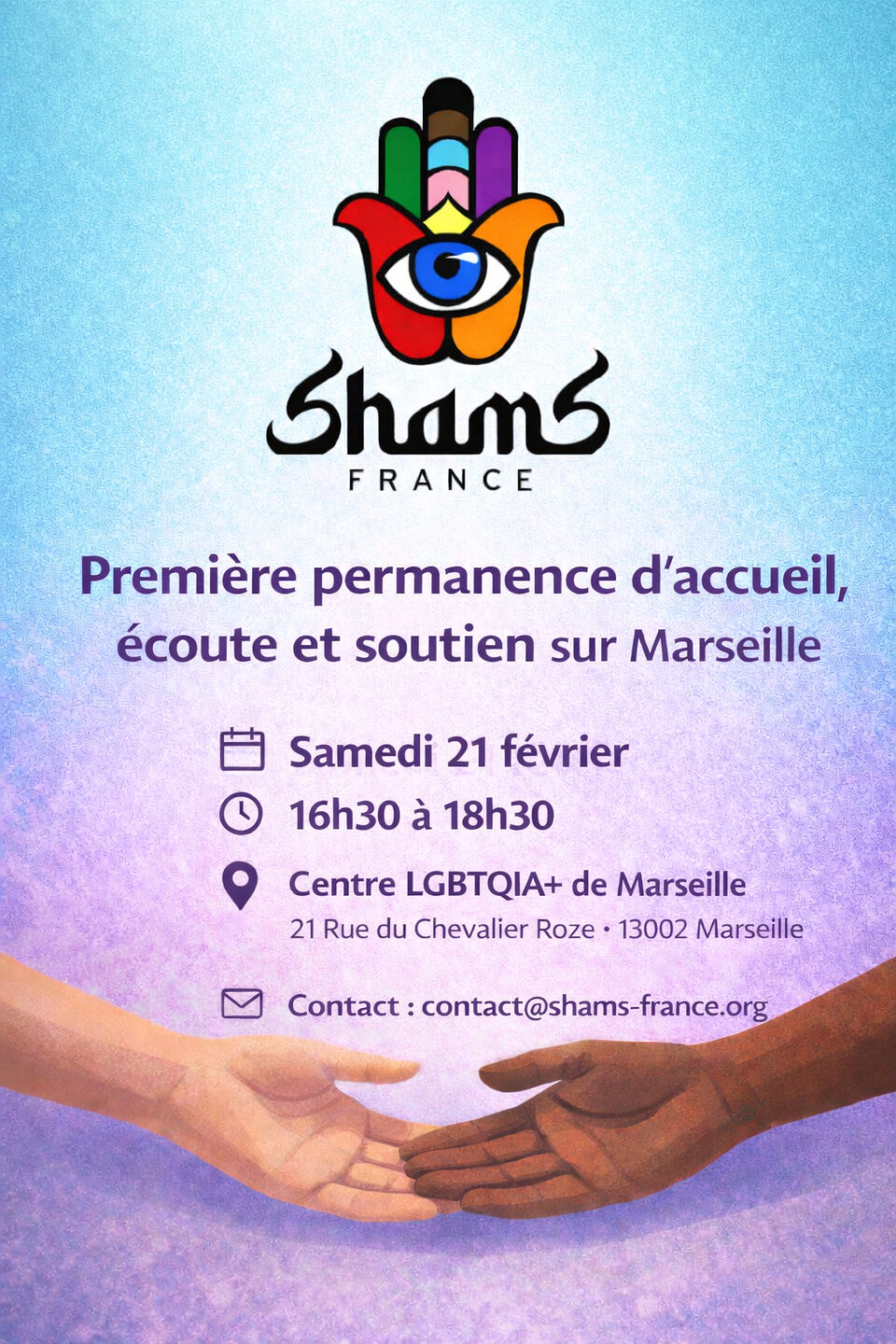Shams-France Marseille met en place des permanences d’accueil individuelles destinées aux personnes LGBTQI+ qui rencontrent des difficultés sociales, administratives, personnelles ou de santé. Ces permanences sont ouvertes à toute personne ayant besoin d’écoute, de soutien ou d’orientation, sans condition, dans un cadre bienveillant, confidentiel et respectueux des parcours de vie.