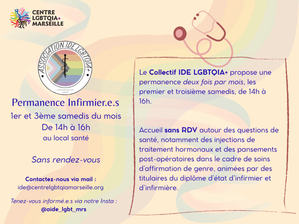 Accueil sans RDV autour des questions de santé, notamment des injections de traitement hormonaux et des pansements post-opératoires dans le cadre de soins d’affirmation de genre, animées par des titulaires du diplôme d’état d’infirmier et d’infirmière.